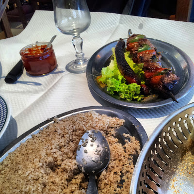 The food arrived. It had been freshly prepared and was delicious. Usually, I do not enjoy cous-cous, but what was served was tastier than any that I had ever eaten previously.The meatballs were delicately flavoured. When I asked the waiter which meat had been used to prepare them, he replied beef. Baldy, who was nursing yet another glass of Pastis, hastened to add proudly that it was not just beef, but it was French beef. Every now and then, he made meaningless exclaimations whenever soething exciting happened on the screen above him. The mustachioed man stood up, went behind the bar, and helped himself to another large whiskey, and then, a few minutes later, a small pitcher of wine.