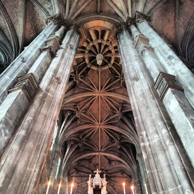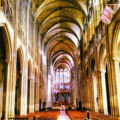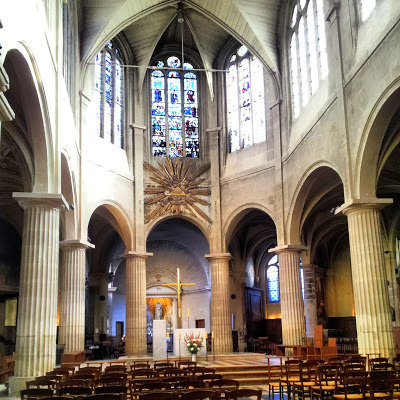 After taking coffee in a small bar, where we were served by another witty barman, we entered the church of St Médard. The church is small and mostly gothic. The neo-classical pillars surrounding the high altar were built later than the rest of the church: