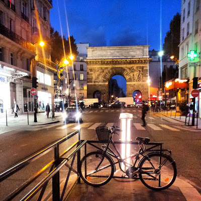 We strolled along the Boulevard Strasbourg that connects the Gare de l'Est with the centre of Paris. Near the station many of the pedestrians were black Africans. There were many crowded, busy hair salons filled with Black women having their hair and nails done. After passing a couple of theatres, we turned off the boulevard and onto the Boulevard St Martin. A short way along it we came across the Porte St Martin: