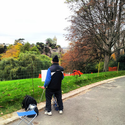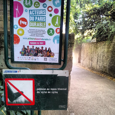 Eventually, we reached the Parc des Buttes-Chaumont, a place that I have long wanted to visit having first learnt about it in Nairn's Paris many years ago. The centre-piece of this 19th century park that spreads across the slope of a hill is a cliff-like rock on the top of which there is a temple-like structure.