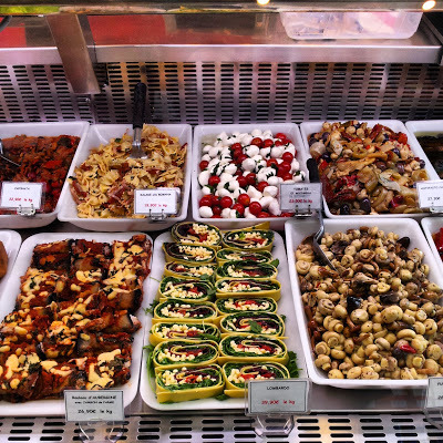 The Rue Mouffetard winds gently up a hillside. It is lined with foodshops displaying a wide range of mouthwatering foods - both ready-to-eat and also raw ingredients. Each display is a work of art: