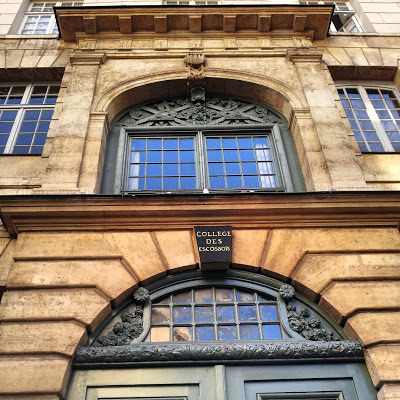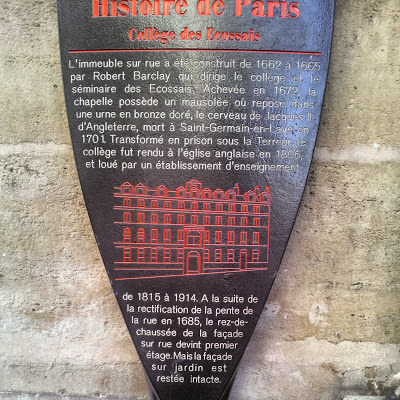 The road ends at a small attractive square at the summit of the slope. A road leads from there downhill towards the Seine, which can be seen in the distance. We passed the house where James Joyce wrote his Ulysses, and soon after that we reached the Collège des Ecossais.
