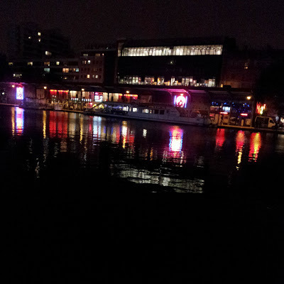 Having had a well-deserved rest in our hotel, we returned to Place Stalingrad to eat at the Canal Huit restaurant, where we ate a couple of days earlier. After eating another excellent meal there, we returned to the Bassin de la Villette, which is quite lively at night.