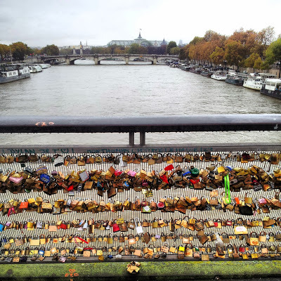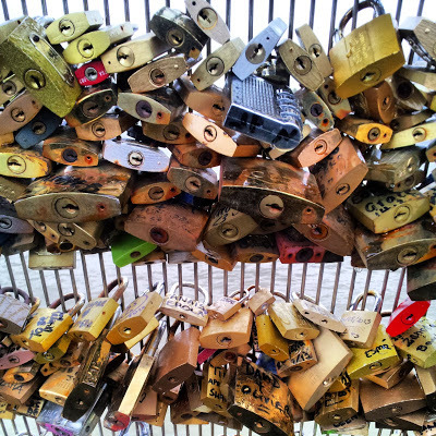 The railings of the foot-bridge are covered with padlocks, love tokens. Apparently, there are so many of these that thier combined weight might threaten the integrity of the bridge.