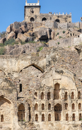 THE GOLCONDA FORT near Hyderabad was constructed between the eleventh and sixteenth centuries. It fell into disuse and ruin in 1687. This extensive ruin is very impressive. On arrival, and even after entering the protected archaelogical compound, men offer their services as guides. Employing one of these is unnecessary because the different parts of the fort each have their own information panels with English translations.