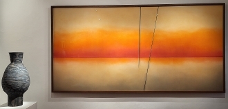 AT FIRST SIGHT, there seems to be little content in the 17 paintings on show at the Tristan Hoare Gallery in London’s Fitzroy Square until the 13th of December 2024. It is not long before you realise that these images that contain larges expanses of colour are quite pleasing and visually intriguing. The artworks, all of which were created in 2024, are by Vipeksha Gupta (born 1989) who lives and works in New Delhi (India). As I looked at her work, I was reminded of the paintings by Mark Rothko in which the viewer is confronted with large areas of colour. In Rothko’s case, the borders between one colour area and its neighbour are deliberately ‘fuzzy’, whereas Vipeksha Gupta defines these transitions more sharply, yet not completely abruptly.