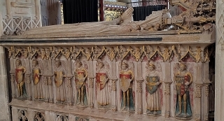The tomb, which bears the carved stone effigy of a woman, and beneath it, a stone carving depicting her after death, is that of Alice, the Duchess of Suffolk (1404-1475). She had been married first to the Earl of Salisbury, who died in 1428. Her second husband was William de la Pole (1396-1450), 4th Earl and first Duke of Suffolk. Fascinating though this is, what really interested me was that her paternal grandfather was none other than Geoffrey Chaucer, whose writing I studied many years ago. Near to Alice’s tomb, there is a less elaborate tomb containing the remains of her parents, Thomas Chaucer and Maud (née Burghersh).