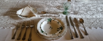 In the early 1990s, we were invited for lunch at a friend’s house. Each of the table settings was almost as elaborate as that which I have described above. I looked at the table, and expected that we were about to be served a multi-course feast. The first course was pasta. I was seated so that I was able to see the kitchen. I noticed that there was a light on inside the glass-fronted oven, but it was empty. When our host offered second helpings of the pasta, everyone, doubtless expecting that much more food would be arriving, declined the offer. I was the exception, and said I would love some more. That is because, having seen the empty oven, I was more realistic about the future course of the meal. I was served my second helping, and then a bowl of salad was passed around. After that, the meal was over. However, we had only used a small proportion of the cutlery laid out at each place setting. To this day, I have been puzzling over the elaborate place settings when only one course was served. Seeing the table at Basildon Park reminded me of this occasion.