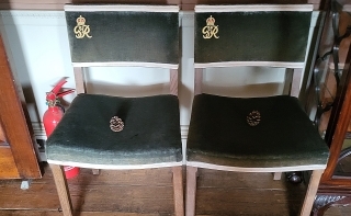 Seeing these chairs reminded me of another chair, which I saw in a cousin’s house in Cape Town, South Africa. It was in this chair that Queen Mary (wife of King George V) had sat for a few minutes when she paid a brief visit to the Mayor’s house in King Williams Town (now called ‘Qonce’) in South Africa in 1946. The Mayor was my mother’s uncle. His grandson, my cousin, has kept this souvenir of the royal visit. I saw it when I visited him in Cape Town. Unlike the chairs at Basildon Park, there is no royal insignia on it.
