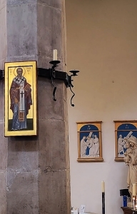 ST CLEMENT’S CHURCH in central Cambridge began being constructed in the 13th century. It was modified in later centuries. While many Anglican churches contain one or two Orthodox-style icons, St Clement’s has many of these, including a large one depicting the Mother and Child, flanked by typical Orthodox style, sand-filled candle holders. In addition, there are several large reproductions of frescos of portraits of Orthodox saints including St Clement. Apart from the Orthodox Church features within the building, there are furnishings that one would expect to find in any Anglican church.