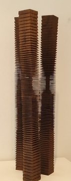 Whereas kinetic art depends on its movement for effect, Bray’s finely crafted sculptures and prints are static. However, as the viewer moves around his artworks, viewing them from different perspectives, what can be seen changes. Bray’s works seem to acquire internal movement that can only be perceived when the viewer moves past or around them. These effects, which add great beauty to his works, cannot be captured using still photography. Three of the sculptures were on display in the churchyard of St Clements opposite the gallery