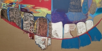 Rachel’s colourful paintings on display vary in size and shape. All of them are more abstract than figurative, but not completely abstract. The artist uses colours well, producing appealing images. Many of them interested me as a retired dentist because most of what was on display included somewhat abstract depictions of jawbones, teeth, lips, and tongues. The artist regards the mouth as being important as it is a portal through which we interact with the outside world, express our feelings, and explore psychological landscapes. If I understand it correctly, Rachel regards the mouth as a gateway to both our inner selves and the outside world. Having read the informative labels that tell viewers about her work, I began seeing, or even imagining, elements of her paintings that might be interpreted as features of oral anatomy.