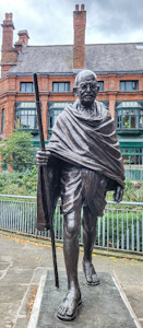 The Mahatma standing by the cathedral in Manchester