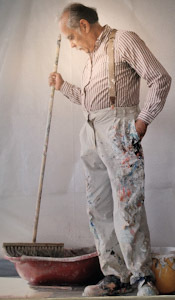 Another distinctive feature of the way Clark worked was his choice of brushes for applying the paint. He did not use artists’ paint brushes. Instead, he threw batches of paint onto his horizontal canvases and worked them into his pictures using ordinary domestic brooms, such as are normally used to sweep the floor. This is illustrated in the film, and the effects he produced using sweeping movements are beautiful and ingenious. In addition to brooms, he also applied paint with his hands, rubbing the paint into the canvas. Clark described that by working on the floor he became more intimately involved with his creations.