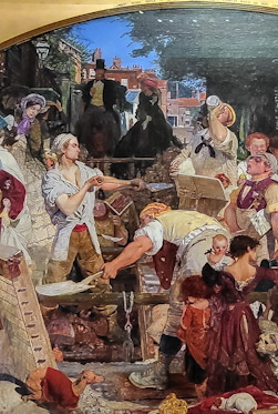 “Work” depicts two labourers (‘navvies) digging a hole in the street as part of the preparations for laying sewers. In the background, there are houses that strongly resemble buildings that can be seen in Hampstead today. The painting was inspired by a book which Brown had read: “Past and Present” by the historian Thomas Carlyle (1795-1881) and published in 1843. The author discussed the nobility of labour in this book. Ford Madox Brown included a portrait of Carlyle on the right side of his painting. The canvas “Work” illustrates the contrast of the hard working labourers with the relatively wealthy, inactive bystanders.