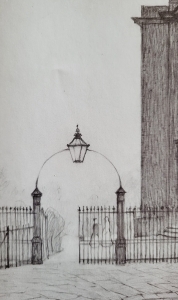 In his book “Lowry’s Lamps”, Richard Mayson noted that overthrow lamps were Georgian in origin and are more likely to be found in front of elegant houses Bath or London than in Manchester, where Lowry created most of his compositions. Manchester did not have many of these smart dwellings. The few examples of this kind of lamp in Manchester were usually to be found at public spaces, such as parks and cemeteries.