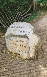 A stone with Chinese characters in a garden in Cambridge