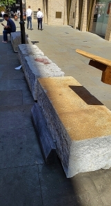 58 of the granite stones have been repurposed to become a series of open-air public art installations. This series was created by Matthew Barnett Howland, Oliver Wilton, and CSK Architects. Small groups of these have been placed in seven locations: St Peter’s Hill, Carter Lane Gardens, St Paul’s Cathedral, Christchurch Greyfriars Church Garden, King Edward St, Little Britain and Smithfield Rotunda. Today, the 31st of July 2024, we came across the group placed in Little Britain, which is not far from Barbican Underground Station. What we saw were 3 of the huge locks of granite arranged in a straight line. A gentleman was using one of them as a bench while he looked at his mobile telephone. Next to them, a wooden sign explained what is going on. This was useful because if there had been no sign next to them, we might not have given them a moment’s notice.