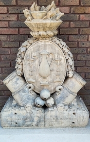 A small information panel next to the crest related that this white material is Coade stone. This material, which was invented in the late 18th century, was an artificial material containing various ingredients. It solidified by firing in a furnace. This durable, weather-resistant material is easy to mould before firing, and was therefore favoured by sculptors and building designers. It went out of fashion by the 1840s.