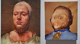 Some of the paintings by Borremans depict the faces of monkeys dressed up in human clothes – 18th century painter’s garb. These paintings were inspired by a work created by Jean Siméon Chardin, who worked in the 18th century. The monkey depicted was not a real one, but a glazed porcelain model. I am not sure what message is being portrayed in these intriguing works.