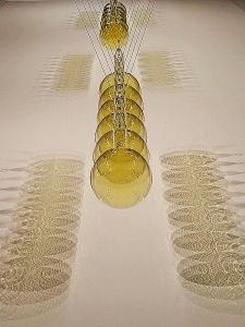 “Familiars 1: Substance Sublimation Unit is a steel ladder made of glass rungs, each filled with an electrical element and crystals of solid iodine. The current ascends the ladder, intermittently heating the rungs, causing the iodine to sublimate into a purple vapour. In Familiars 3: Cradle, named after Newton’s cradle, 18 vacuum-sealed glass spheres are filled with lethal yellow-green chlorine gas. If smashed together, the gas – a respiratory irritant – would be released into the air. In Familiars 2: Hypostasis, three tall, curved metal poles, reminiscent of Islamic arches, contain bromine-filled tubes at the tips.”