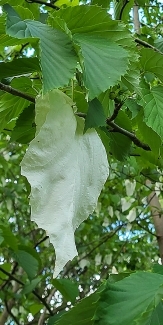 Yesterday (the 15th of May 2024), we saw a curious tree at Kew Gardens. It looked as if it had both green and white leaves. It is a Handkerchief tree (Davidia involucrata). The white appendages are not leaves but bracts. They form for about a fortnight each year, and serve to increase the chances of the tree’s flowers being pollinated.