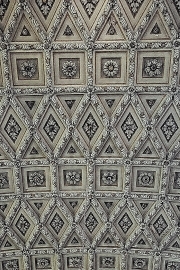 The walls of the nave are bare. It had been intended to have been painted, but this never happened. What really attracts the eye is the amazing geometric ceiling above the nave (see photograph). The ceiling is an expanse of triangles, squares, and lozenges that cover its barrel vaulting. In the centre of each of these many shapes, there is a sculpted flower. This ceiling was designed by Chrysostom Wilkins, who worked on other churches in London. It was created in plasterwork, shaped by hand, without using moulds.