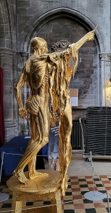 Hogarth was a successful artist in his time, and has become recognised as one of the famous British artists of the 18th century. Not far from the font, there is a dramatic gold coloured sculpture by one of the most famous British artists of our times – Damien Hirst (born 1965). The sculpture, which is on loan from the artist, is called “Exquisite Pain.” It is Hirst’s depiction of St Bartholomew holding his skin, having been flayed. The church’s website (www.greatstbarts.com/visiting-us/artworks/damien-hirst-exquisite-pain/) revealed: