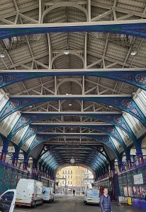 “At Peters Lane, Cowcross street turns southward towards to meet St Johns Street, which commences at the north side of Smithfield Market, an indoor wholesale meat marketplace. Smithfield’s central Grand Avenue is entered through an archway flanked by two heraldic dragons and a pair of stone sculptures. The Avenue runs beneath a high roof supported by ornate painted ironwork arches. Side aisles are lined with the meat dealers’ stalls and glass-covered display cabinets. In 1852, London’s livestock market was moved from Smithfield to Copenhagen Fields in Islington (off Caledonian Road, where the Caledonian Park is now located). This cleared the area for the construction of the present meat market, which was completed by 1868. Constructed in an era before refrigerators were used, the market was designed to keep out the sun and to take advantages of prevailing breezes.”