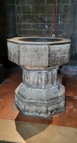 Both the objects of interest stand in the southwest corner of the church, close to the entrance that leads to the path that runs along the location of the long-since demolished apse of the priory church. The two things stand a few feet from each other. One of them is a carved stone font, said to be one of the two oldest fonts in London – the other being in the parish church of St Dunstan & All Saints in Stepney. What interested me about St Bartholomew’s font, which is still in use, is that it was here that the painter William Hogarth (1697-1764) was baptised. He had been born in a house in Bartholomew Close near the church in the Smithfield district of London.