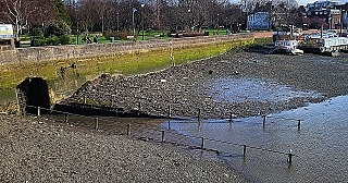 Today, the 25th of February 2024, we were walking past Furnivall Gardens along the riverside path. It was low tide. A wide, not too clean, beach lined the river. At one point, the beach was interrupted by what looked like the mouth of a small stream. This was lined on both sides with wooden fencing. The stream, which issued from below the riverside walkway ended abruptly in an archway that was filled by a sturdy door or dam. The position of this sluice gate in relation to the nearby Dove pub, Dove Pier, and Furnivall Gardens is correct for what must have once been the mouth of Hammersmith’s erstwhile Creek. I had noticed the archway with the heavy-looking door many times before, but today, because of the low tide, it was the first time that I could clearly the remnants of the mouth of the Creek. I suppose that there is some leakage from the now covered-up Creek that causes the appearance of the mouth of a small stream when the tide is out.
