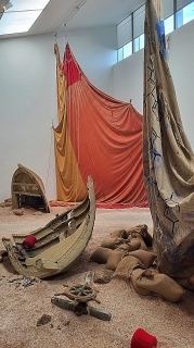 Anna’s show at the Turner is called “The Sunken Boat: A glimpse into past histories”. It consists of three installations, one in each of three spacious galleries. One gallery contains an installation comprising a set of sandy beaches littered with the remains of wrecked boats and sails along with other flotsam and jetsam. The walls of the room have frames containing images relating to historical and ecological events. Regarding this fascinating and beautifully composed exhibit, the gallery’s website noted that the installation: