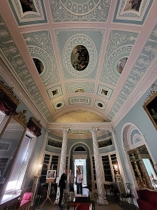 “This is one of the finest Adam rooms in existence … The shape of the room, with its curved ceiling leading into two apsidal ends, on the chords of which are pairs of columns, is one which Adam used for several of his most stately interiors. Apart from the plan, a great innovation for England was the flat arched ceiling which Adam frankly describes as ‘extremely beautiful …”