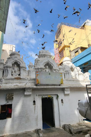 WHILE WALKING ALONG Bangalore’s Avenue Road, which runs from City (KR) Market to Palace Road, I spotted a mandir (Hindu Temple) down a side street. It was painted white, and its facade was surmounted by three tall niches, each containing a sculpture.