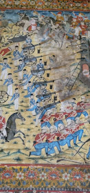Most of the north wall is covered with a mural depicting a battle between the British East India Company and the Marathas. Most of the picture shows features of the British forces in great detail. There are even several flags that resemble Union Jacks. Some British soldiers, dressed in red uniforms, can be seen riding elephants. Whoever painted this wall had a good eye for both detail and representation of battles.