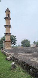 Our autorickshaw driver, realising our interest in historical buildings, suggested that we visit another mosque, which we had not seen before. Called the Ek Minar ki Masjid (ie ‘One Minaret Mosque’), it lives up to its name. Built in the 16th century, at the same time as other mediaeval mosque in Champaner, all that remains today is the large plinth on which it stood, a small fragment of wall, and a single intact minaret. The base of the minaret, like that at Kamani and other mosques built in that era, is decorated with geometric patterns. Standing alone, it is a splendid example of a 16th century minaret.