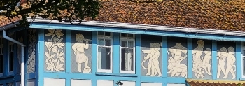 The sgraffito friezes on each of the three former stable blocks that we saw are in good condition. The coach houses were built in about 1882 and designed by John Pollard Seddon (1827-1906), who was closely associated with the Pre-Raphaelite group of artists. The sgraffito work on the coach housed is said to have been created by the sculptor George Frampton (1860-1928), whose other works include the Peter Pan statue in Kensington Gardens and a statue of Queen Victoria in the grounds of the Victoria Memorial in Kolkata. An article published in the Thanet Times in the 1970s revealed: