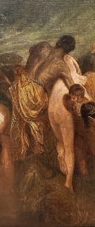 Moving away from the room in which the Rothko painting is hanging, I came across another Turner painting that interested me, “The Deluge”, which was first exhibited in about 1805. In the bottom right corner, Turner has painted a black-skinned man rescuing a naked white woman. On close examination, the man can be seen to have a chain around his waist. The Tate’s caption to this picture includes the following: