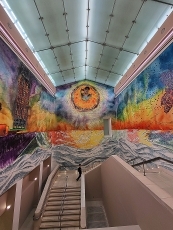 At the top of the stairs, there are panels explaining the wall paintings. There is also one of Ms Saye’s photographs. Called “Andichrai”, it is from a series of photographs she created in the last year of her life. The photograph, which is a visually intriguing artwork, shows a woman holding an andichirai to her ear, It looks as if Ofili used this photograph to create his image of Khadija in his “Requiem” mural.