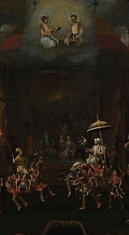 An artist, Willem Schellinks (1623-1678), one of Rembrandt’s contemporaries is represented in the MK Gallery’s exhibition. He, like Rembrandt, is believed to have studied an album of Mughal paintings, which was thought to have been in the possession of the English art collector Alethea Howard (1585-1654), Countess of Arundel, who lived in Amsterdam from 1641 until her death. Incidentally, her portrait was painted by Peter Paul Rubens (1577-1640). In addition to sketches, Schellinks is known to have painted at least six paintings that contain Indian imagery (see the detail above). One of these and a sketch are on display at the MK Gallery.