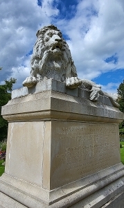 The lion commemorates the deaths of Captain Charles Frederick Lendy on the 15th of January 1894, aged 30. And his brother Edward August William Lendy on the 23rd of December 1893, aged 25. Charles died in Bulawayo (now in Zimbabwe) during the Matabele Campaign. And Edward, who was a captain in the Sherwood Foresters and Inspector General of the Sierra Leone Frontier Police, died in Warina (in Sierra Leone). According to a website (https://victorianweb.org/sculpture/warmonuments/9.html), he died as a result of ‘friendly fire’, and Charles died “from the effect of the Matabele campaign”, whatever that might mean. According to another website (www.photosunbury.com/lendymemorial4.htm), Charles