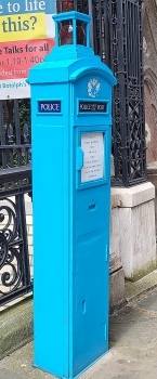 “A few examples of similar posts exist in Westminster and throughout the country, but those differ slightly in design and colour. The Westminster models bear a Royal crest above the front ‘POLICE POST’ panel, and are painted dark blue.”