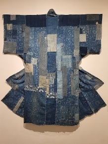 The exhibition has a fine collection of exhibits demonstrating the Japanese tradition of recycling old materials to create new objects. In a country where raw materials were highly valued, it made a lot of sense not to waste them, but to re-use them. We saw many examples of ‘Boro’ textiles. These are items made by fashioning worn clothing and waste fabrics to create another usable textile. Often, a large piece of used material with damage (e.g., holes) was made usable by patching it with scraps of waste material. Both quilting and Boro involve sewing pieces of material together. Unlike quilting, which uses scraps of material to create a brand-new entity, Boro uses scraps to restore worn textiles to make them usable again. There were also examples of ‘Washi’ on display. This is handmade paper concocted from already used sheets of paper (for example from discarded account books). The Washi was made waterproof by painting it with persimmon paste. Washi paper was used for many purposes including wrapping valuable clothing, floor coverings, room dividers, making bags, and more. For example, there was a conical hat made in leather and lined with waxed recycled Washi paper. In addition to these recycling techniques, there were several others. One which caught my attention was ‘Sakiori’, which in many ways resembles the North American and European rag weaving technique.