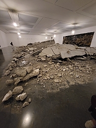 The long central corridor is lined with a large variety of ‘objets trouvés’, which some might well describe as ‘junk’. Together, they form a large-scale cabinet of curiosities like those which wealthy people used to create in the past, but few of the objects would have appealed to such collectors. Three large rooms can be entered from the corridor. The walls of each of these are lined with what at first sight look like enormous paintings. They are made of metal, often quite three-dimensional, and coloured with paint. Each one is both visually exciting and satisfying. In the middle of each room, there is an installation that suggests that it has formed after some apocalyptic event – maybe, an atomic bomb explosion or some similarly catastrophic event. In one room, the centre is filled with a pile of sand in which discarded supermarket trolleys have been abandoned. Another room is filled with what look like huge books damaged by flood waters. In the third and largest room, there are the concrete and rusted iron remains of what might once have been a modern building – it is a scene of horrendous devastation.