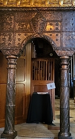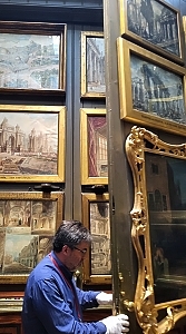 Soane lived in his houses, had his architectural workshops there, kept a picture gallery, and created a museum. The picture gallery is ingenious. A small square room, lit from above, has some of the pictures arranged in two layers, one covering the other. The wall carrying the outer layers of pictures is in fact a huge, hinged door, which can be opened to reveal the pictures on the layer it covers (see the photo above). By this method, Soane created much more hanging area within the room. The pictures and drawings include many by Hogarth and Piranesi, and at least one by Canaletto. There is also a pair depicting Soane and his wife. Other pictures depict buildings designed by Soane as well as projects that he planned but were never fulfilled. To squeeze so many large artworks into such a small room, where they can be viewed comfortably, is a work of genius.