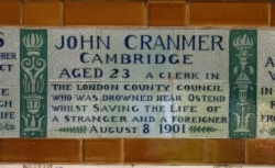 Apart from the numerous paintings and sculptures created by Watts, one of his most unusual works is neither a sculpture nor a painting – it is what one might describe as a precursor of Conceptual Art. Although attractive, the concept that it conveys – self-sacrifice – is more important than its appearance. Located in Postman’s Park, which extends from Aldersgate Street to King Edward Street, it is a memorial to ordinary people who lost their lives during peacetime whilst trying to save those of others. Created in 1898 but conceived by Watts in 1887, the work of art is called “Memorial to Heroic Self-Sacrifice”. It consists of a stretch of wall protected from the elements by a wooden loggia, which was designed by Ernest George who helped design the buildings at the Golders Green Crematorium. On the wall there are memorials to those who sacrificed their lives whilst rescuing others. Each memorial is made of ceramic tiles and records the name of the hero and a brief account of how he or she met their deaths. The first four memorials were designed and made by William de Morgan. Later, others were made by the Royal Doulton pottery. There is room for 120 memorials but by 1931, only 53 had been placed. In 2009, the Diocese of London permitted another memorial to be added.