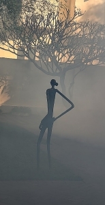 In the garden surrounding the building, we saw several sculptures. As the sun set, a worker moved around the garden spraying a fumigating smoke that created an eery mist. The sculptures were temporarily partially hidden, becoming rather like peaks partially concealed by low clouds. Gradually, they reappeared as the insecticidal smoke dispersed. Having seen the KAASH gallery, we decided that it would become a place we visit whenever we happen to be in Bangalore.
