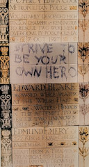 The artist Susan Hiller (1940-2019) was born in Florida (USA) and died in London. Apparently, she was surprised by how few people noticed the memorial in Postman’s Park, let alone read the tragic plaques. I am one of the few, who have done so. So, as soon as I got near to an artwork displayed in a temporary exhibition in the Tate Britain art gallery, I knew it was based on the plaques in Postman’s Park. The piece consists of 41 photographs of plaques on the Memorial, which have been arranged on a wall by Susan Hiller. In the centre of this artistic array that she has called “Monument 1980-1”, she has placed a plaque which consists of a stretch of tiling on which the words “Strive to be your own hero” have been crudely written with black paint.