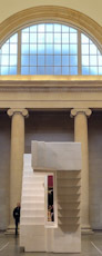 The artist has made a plaster cast of the space enclosed by the staircase in the building housing her studio. When you look at the artwork carefully, it can be seen to consist of sections of plaster, rather than one single piece. I am guessing that what Whiteread did was to make plaster casts of parts of the staircase, its walls, and ceiling, and then assembled them to create what is effectively the shape of the space enclosed by them. The result is something that at first glance makes one think of staircases, but after a few moments realisation, you notice that it is not what it first seemed to be.