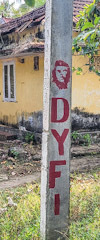 All along the path, there was a series of concrete poles that supported overhead electricity cables. On almost every one of them there was red painted graffiti. Many of the poles were daubed with the initials ‘DYFI’, which stands for the Democratic Youth Federation of India, which is affiliated to the CPI(M) – the Communist Party of India (Marxist). Some of the poles also had depictions of the head of Che Guevara and five-pointed red stars or the letters ‘CPIM’. One pole had “Viva Revolution” on it and some others were daubed with the names of countries including Mexico and Bolivia, At least one house along our route had a large hammer and sickle painted on it. With the exception of the country names, all of these manifestations of Communism are frequently seen all over Kerala, which at times has been ruled by Communist governments,
